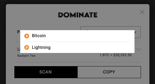If you configured and enabled both the On-Chain and Lightning Network methods, the customer will be able to choose between them within the pop-up.